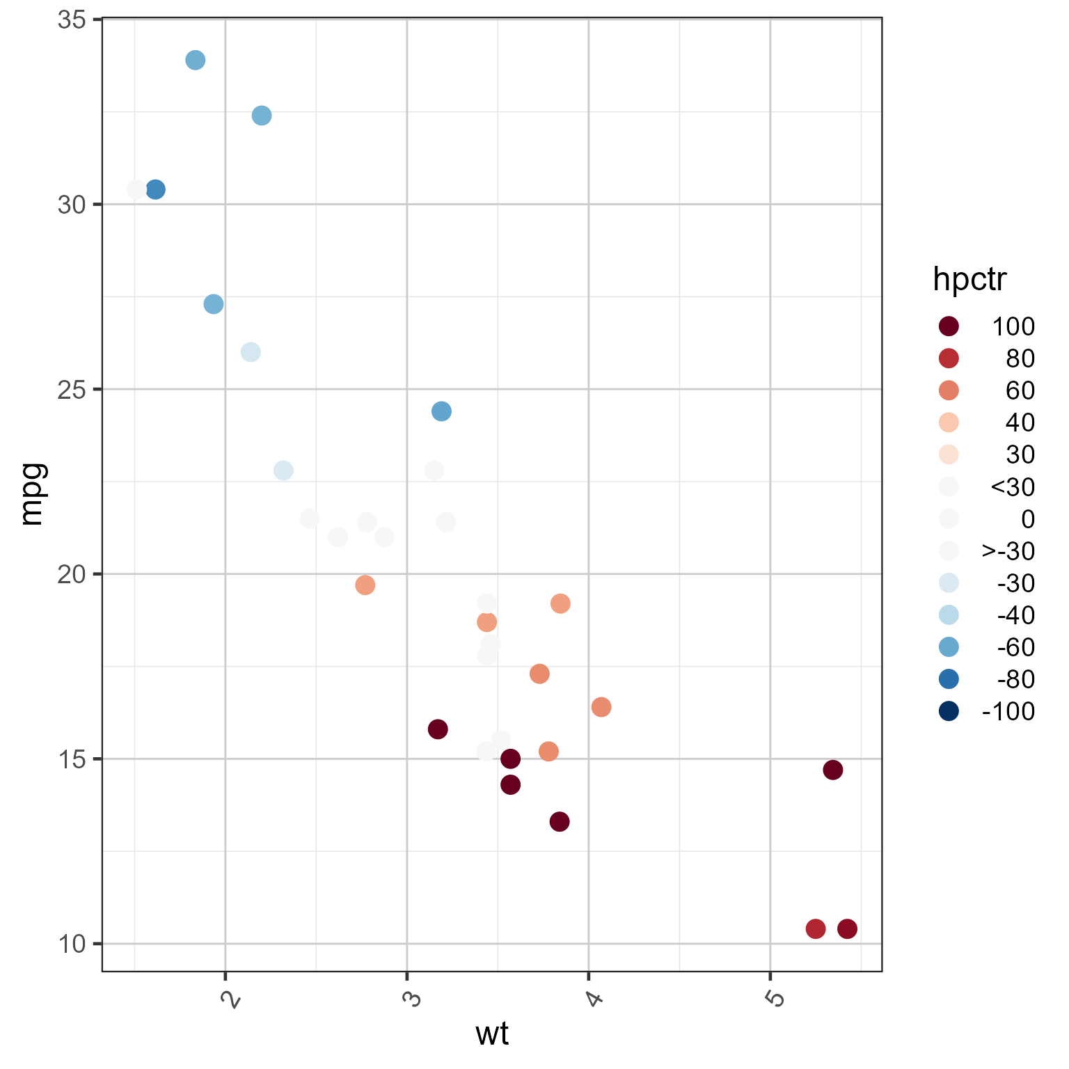 ggplot2::ggplot(mtcars2, ggplot2::aes(wt, mpg, colour=hpctr)) +