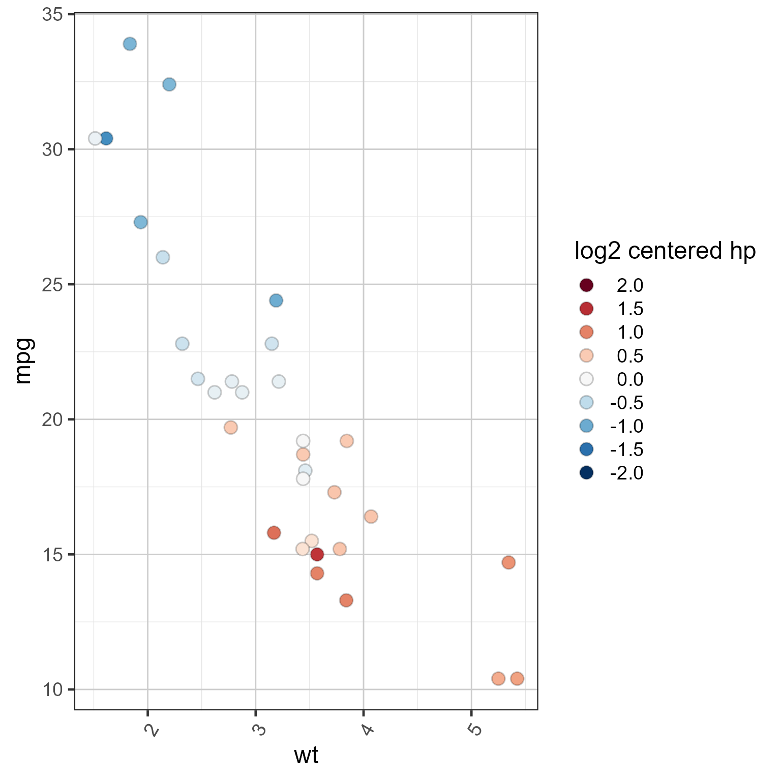 ggplot2::ggplot(mtcars2, ggplot2::aes(wt, mpg, fill=`log2 centered hp`)) +