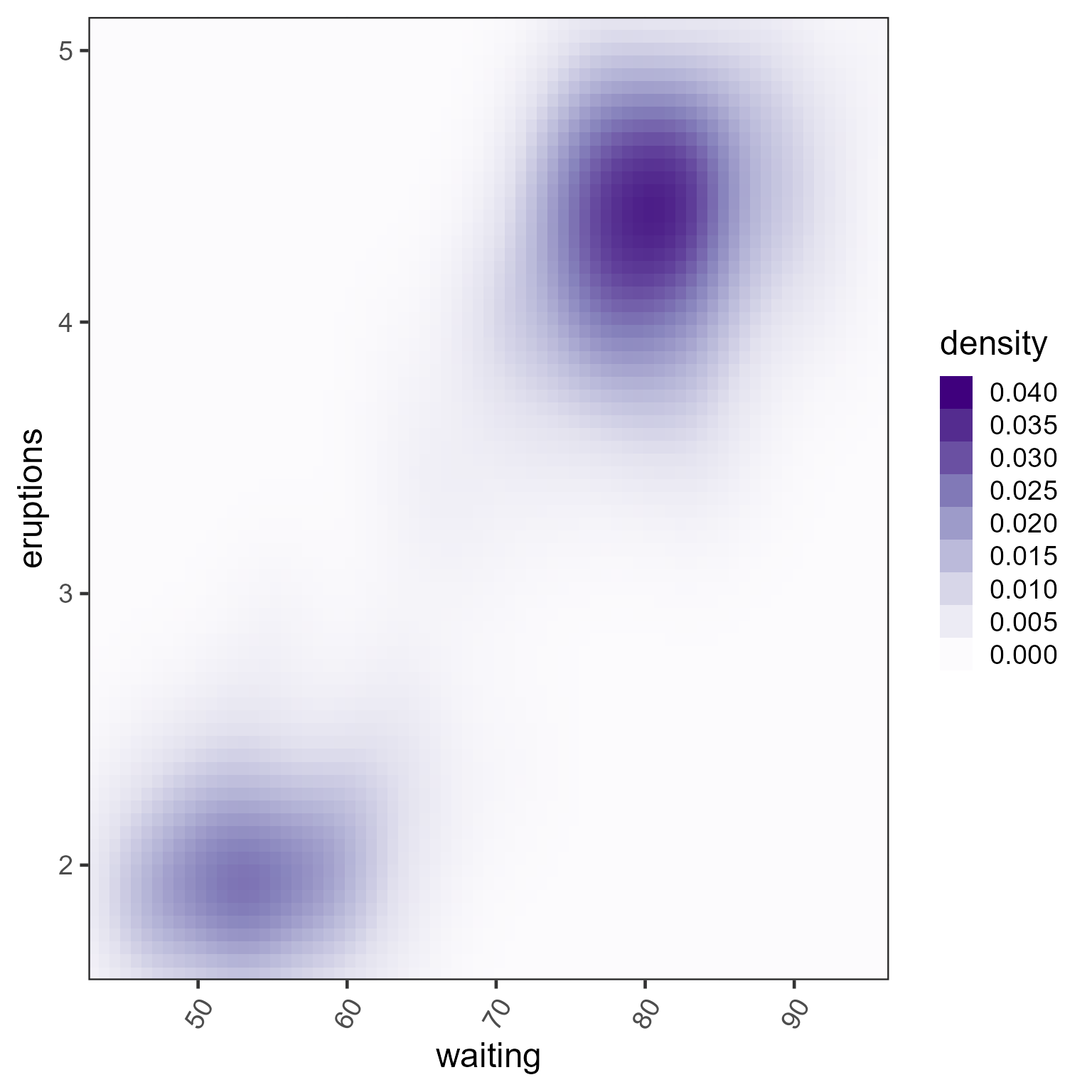 ggplot2::ggplot(ggplot2::faithfuld, ggplot2::aes(waiting, eruptions, fill=density)) +
